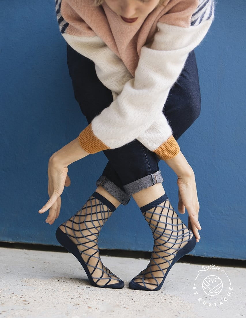 Délicatement quadrillées, ces chaussettes transparentes mélangent un bleu marine avec un bleu jean. Elles peuvent être portées avec un look jean-baskets pour ajouter une petite touche d'originalité. Ce modèle est inspiré du croisement des câbles du Brooklyn Bridge de New-York.