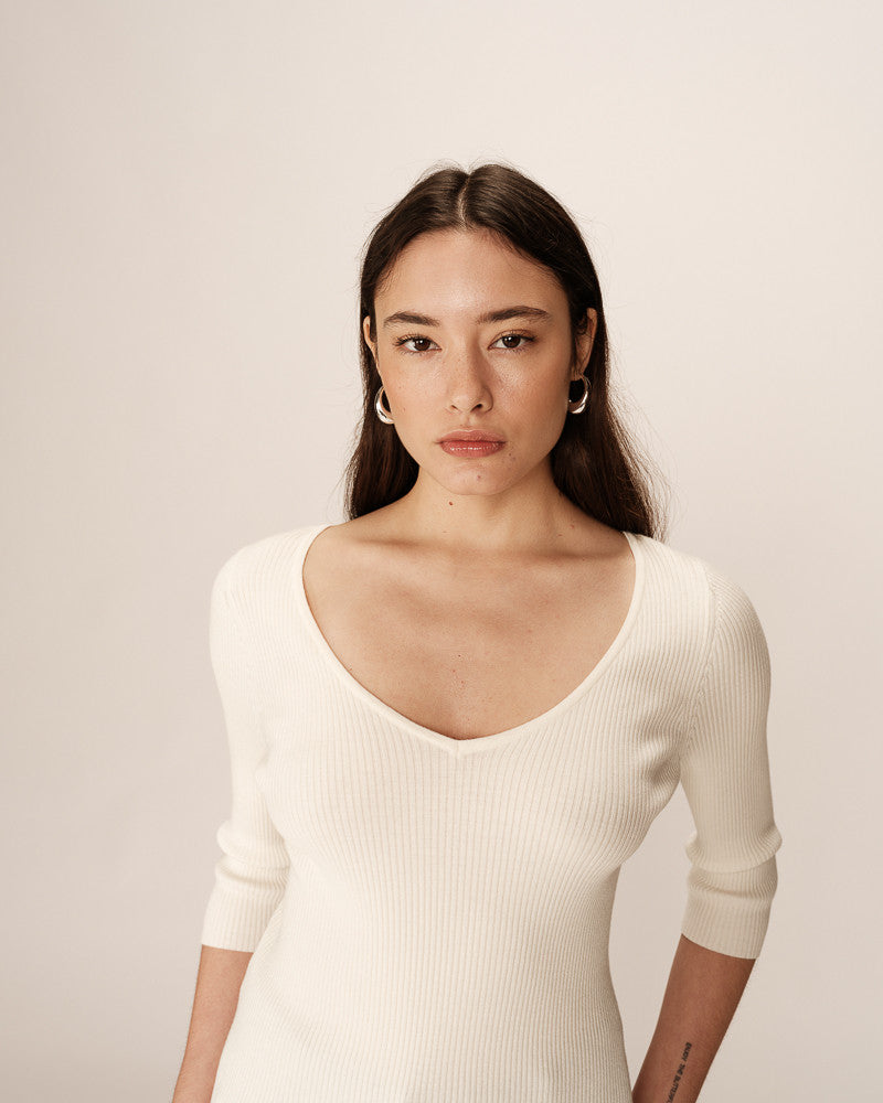 Le pull PAIGE revisite les silhouettes signatures de Grace & Mila avec élégance. Ce modèle à la fois sobre et féminin arbore une coupe droite, fonctionne en maille fine côtelée, et est doté de manches 3/4 ainsi que d'une encolure en V flatteuse, pour sublimer délicatement le port du cou.