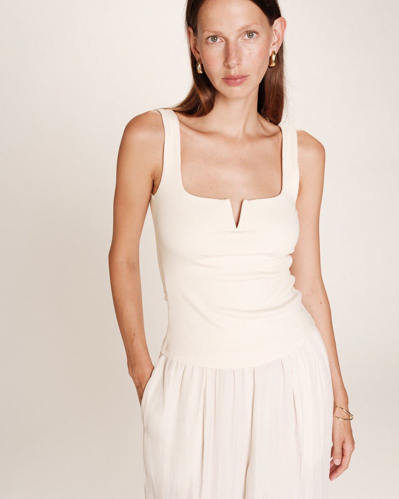 Confectionné dans une matière douce et stretch, il se porte facilement sous une veste chic ou associé à un jean taille haute pour une allure casual soignée. L’encolure carrée, agrémentée d’une fente subtile à l’avant, apporte une touche moderne et féminine à ce débardeur minimaliste.